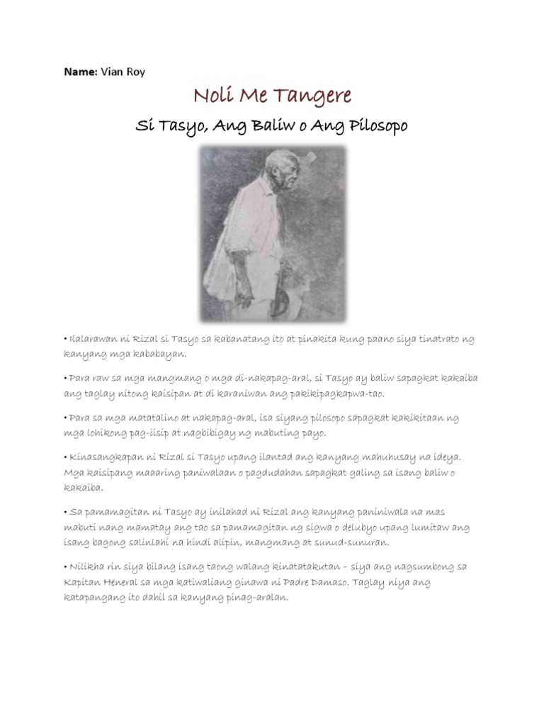 Nag-uusap si Don Filipo at Pilosopo Tasyo tungkol sa pagtanggap ng alkalde sa pagbibitiw ni Don Filipo. Akoy kilala bilang isang baliw ng mga hindi edukadong tao dahil sa iba kong pananalita pag-iisip at pakikitungo sa kanila samantala ako naman ay kilala bilang isang henyo ng mga taong matatalino dahil sa labis kong. 14 Ang Baliw o ang Pilosopo Si Pilosopo Tasyo dating Don Anastacio ay laging laman ng lansangan walang tiyak na direksyon ang kanyang paglalakad.