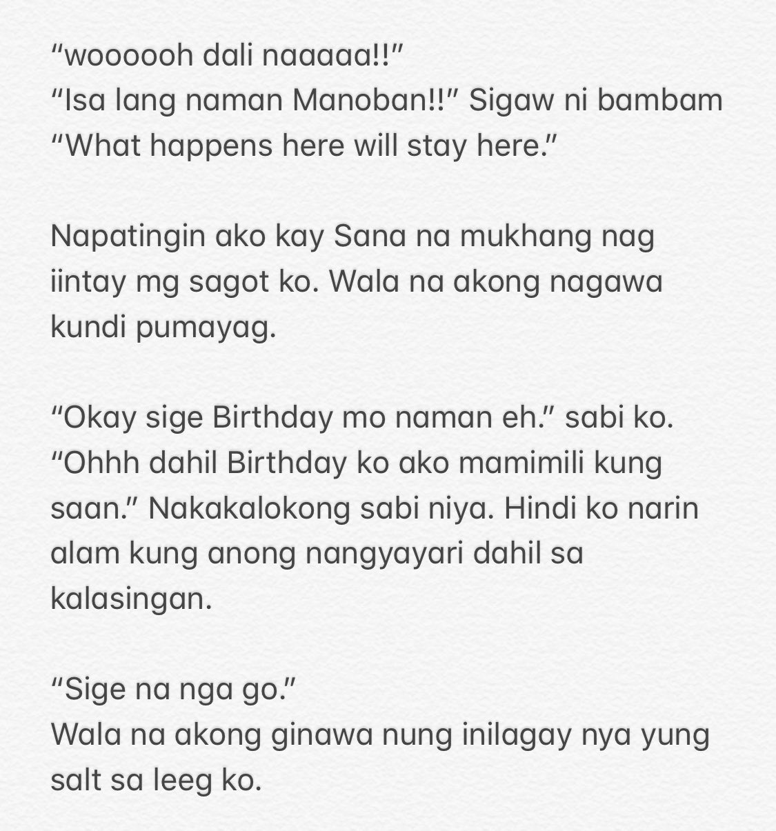 Sinabi niya sa akin na baliw. Nababasa ka na bulong niya sa akin. Parang may nagwala sa tyan ko at ramdam na ramdam ko ang mabilis na daloy ng dugo ko sa buong katawan.